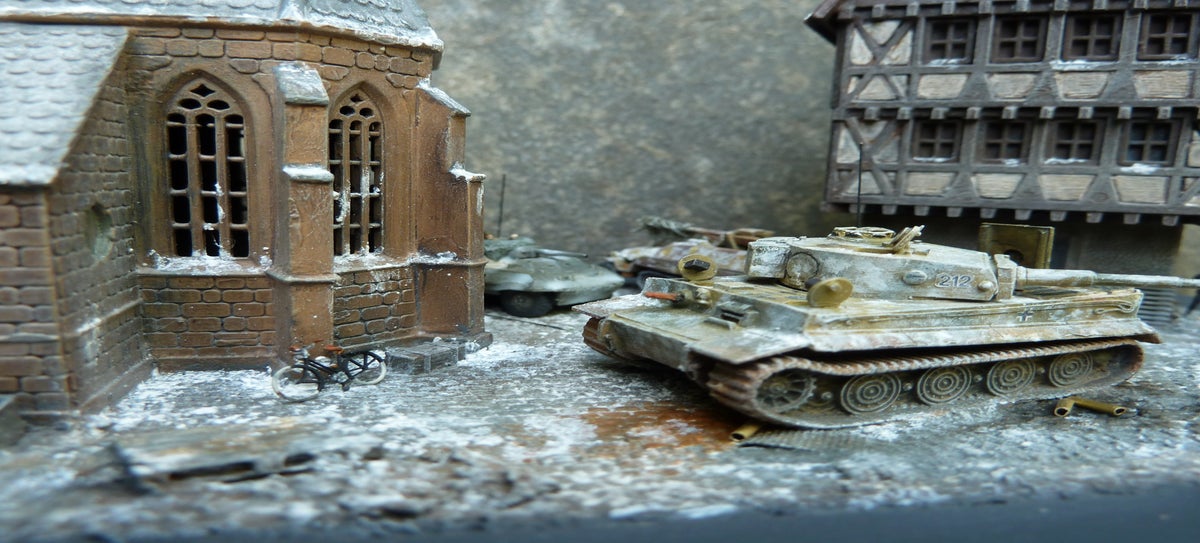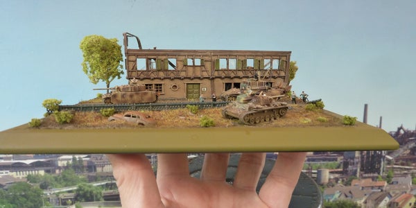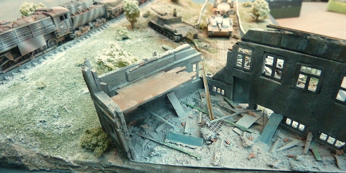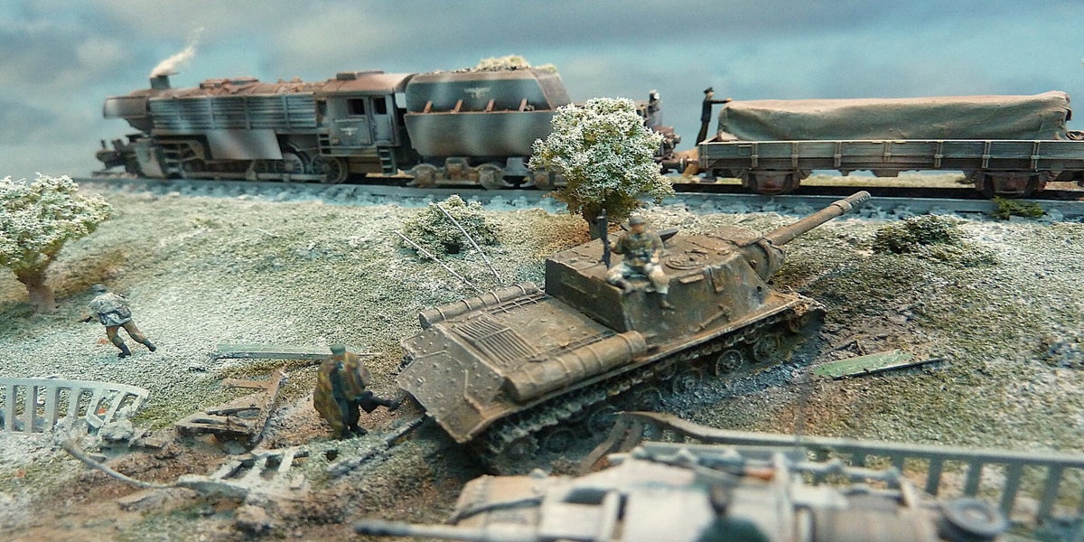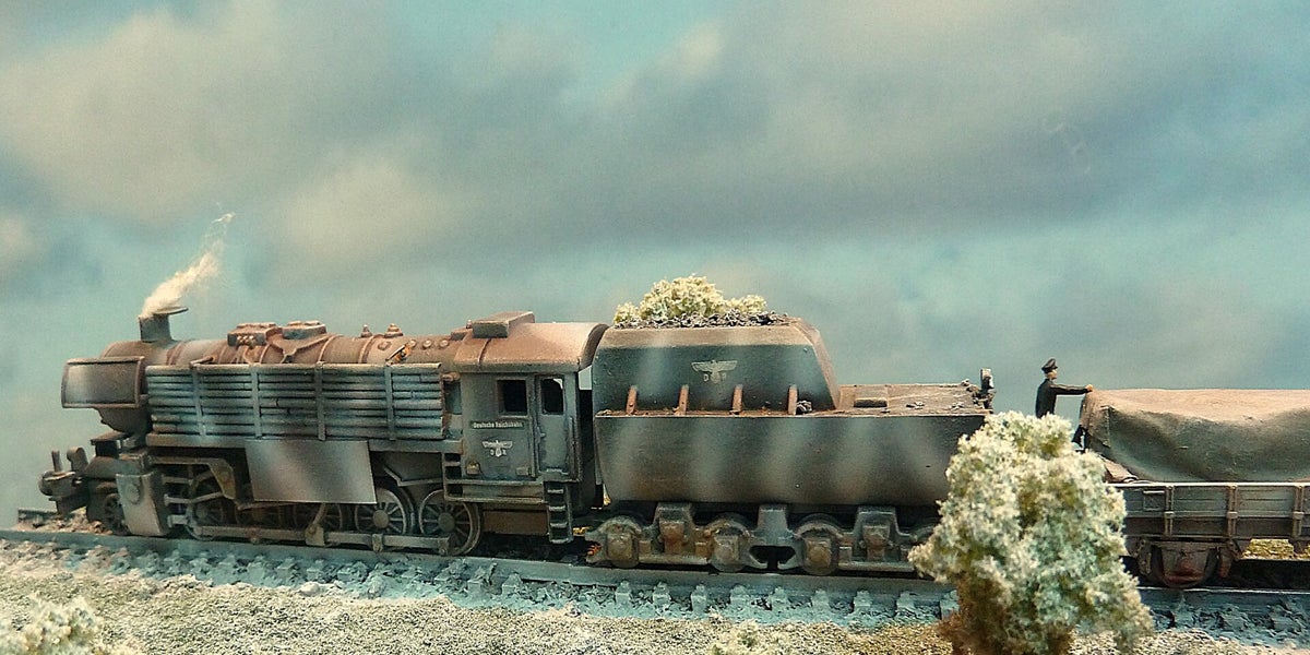 The diorama shows a Kriegsloc 52 that has just come to a stop. Two refugees are trying to board the train, seeking safety. Additionally, you see German vehicles and a disabled Russian tank. On the side, there is a small grenade impact visible. But who disabled the tank? Was it the German tanks, or was it the figure with the panzerfaust? The locomotive is a static, painted model from the brand DeAgostini, which is no longer in existence and no longer produces these models. I have modified and improved this model by adding wooden armoring around the steam boiler. This was a common modification on the Eastern Front to protect the steam boiler from shell fragments and gunfire.