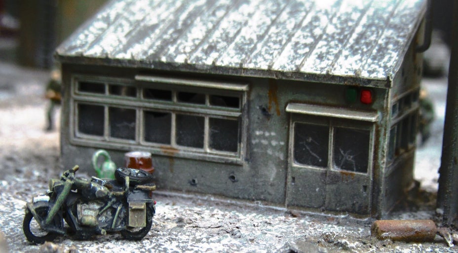 Op de diorama’s vind je een grote variatie aan gebouwen, vrijwel allemaal uitgevoerd in schaal N. Deze schaal is perfect te combineren met schaal 1:144, wat het tot een populaire keuze maakt. Het aanbod in deze schaal is enorm, en voor mij is het een sport om deze gebouwen voordelig op de kop te tikken tijdens modelspoorevenementen. De meeste gebouwen die ik aanschaf zijn tweedehands (soms zelfs derdehands) en al in elkaar gezet. Vervolgens haal ik ze zorgvuldig uit elkaar, bouw ze opnieuw op en geef ze een grondige metamorfose. Dit zorgt voor een perfecte pasvorm en de gewenste uitstraling op het diorama.